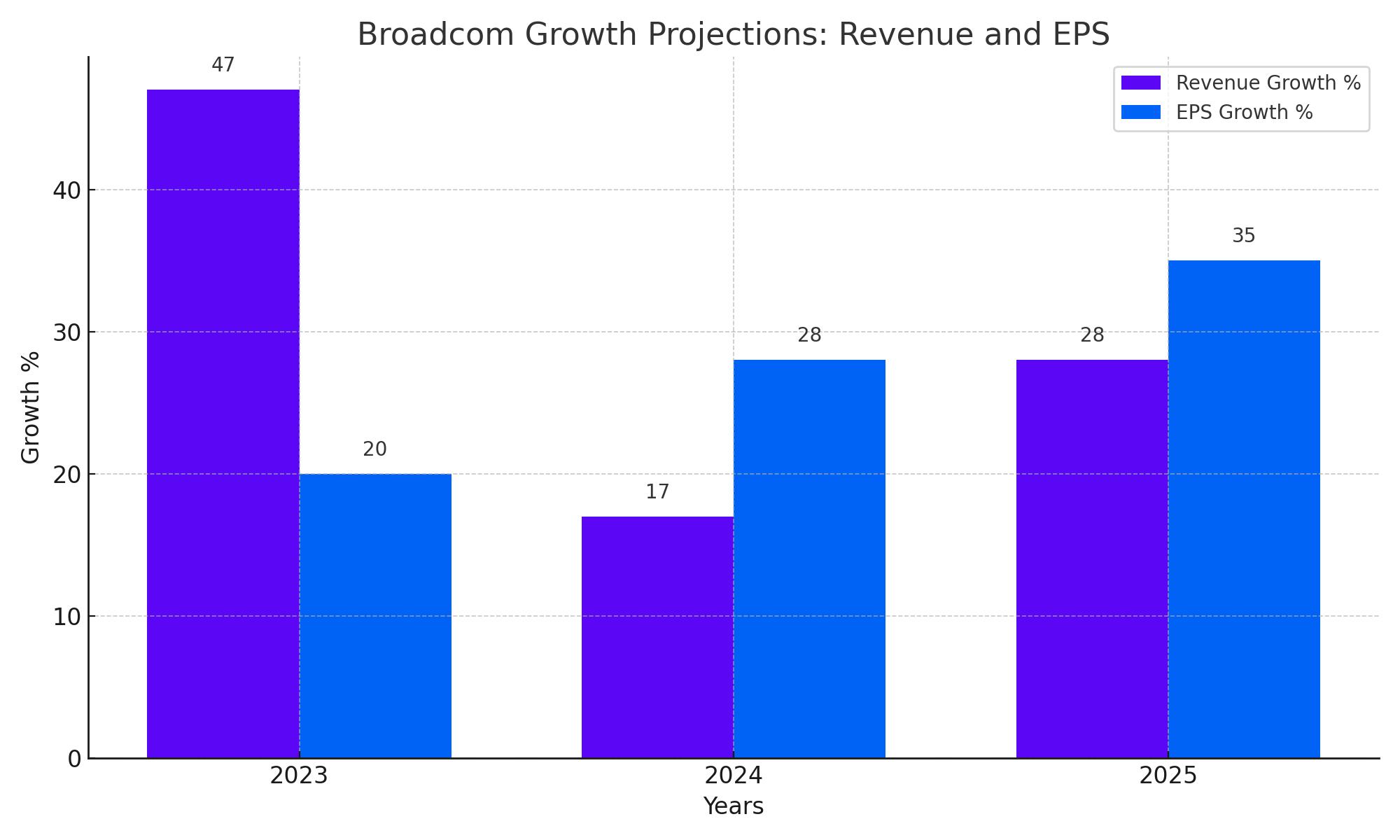 While Broadcom’s current price-to-earnings (P/E) ratio of 41 might appear elevated, it is justified by the company's strong growth prospects. Broadcom is projected to see a 28% EPS increase in 2025, bringing its P/E ratio down as earnings continue to expand. Analysts predict that the P/E ratio could fall below 20 by 2027, making it an attractive long-term investment.