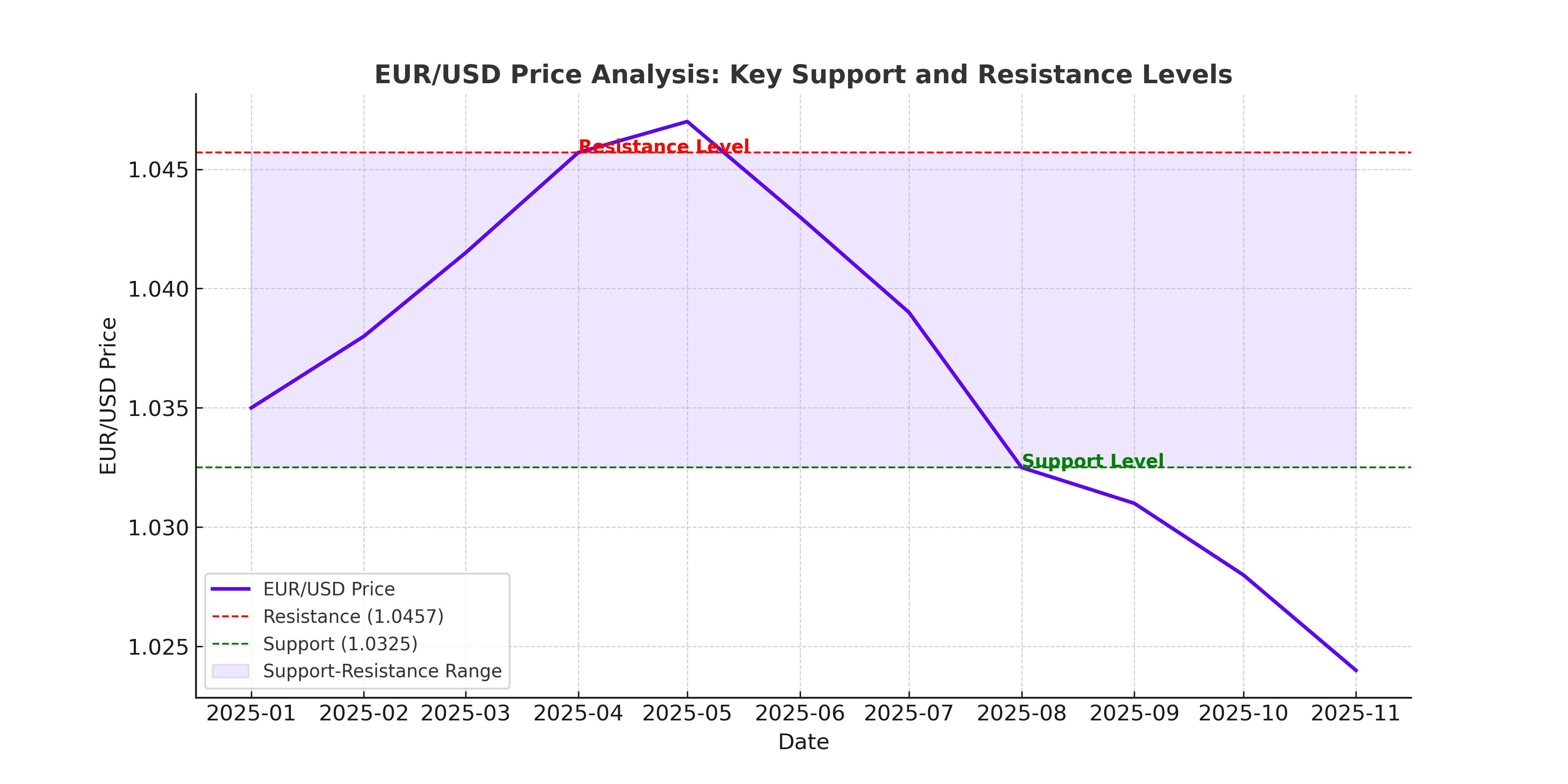 From a technical perspective, the EUR/USD pair faces significant resistance near 1.0450-1.0460. This level aligns with the upper boundary of the current bullish channel observed on the 4-hour chart. Although the pair trades above the 30-SMA (simple moving average) and the RSI (relative strength index) remains in bullish territory, bearish divergence signals caution. The RSI’s failure to confirm recent higher highs suggests a potential downside movement.